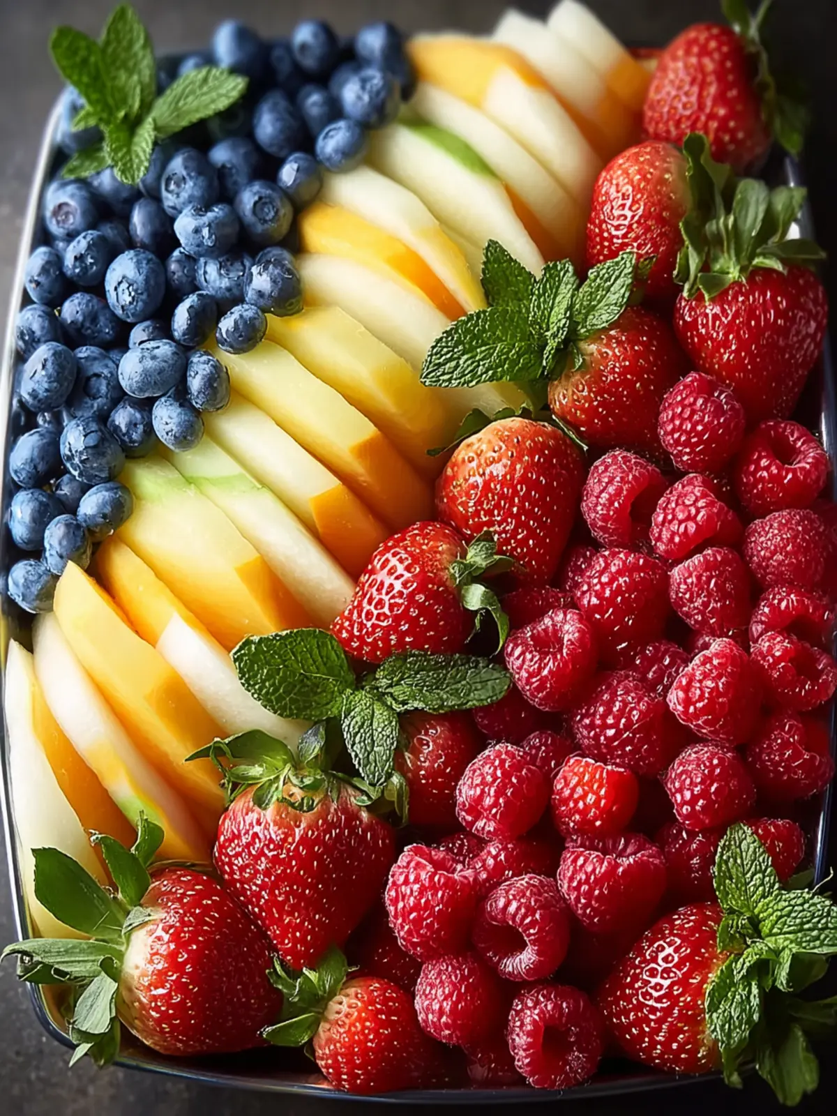 - Arrange fruits on a large serving tray in a decorative pattern.