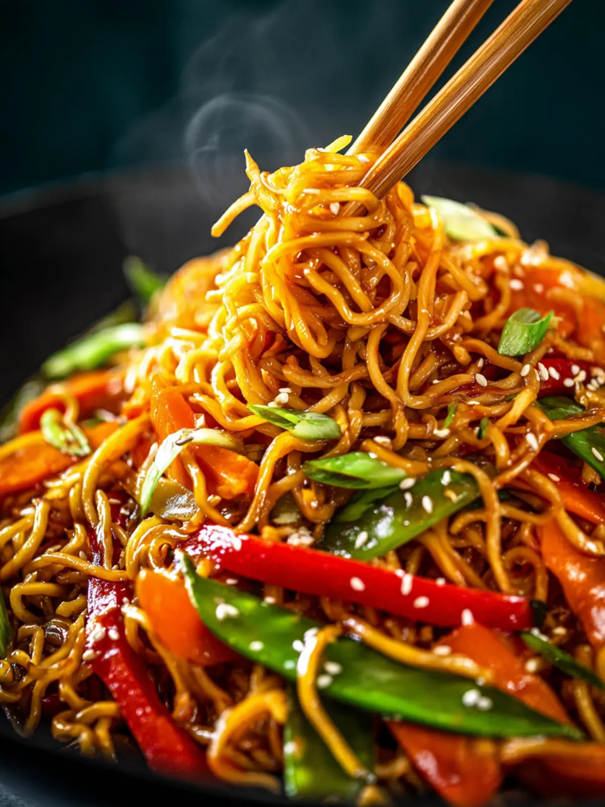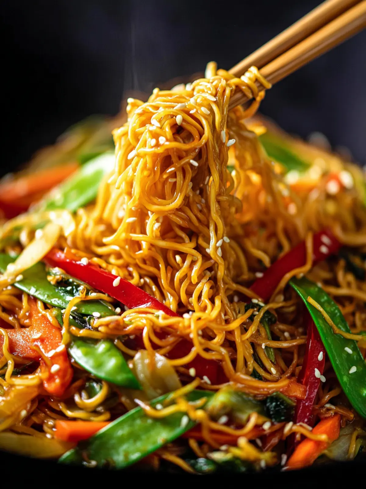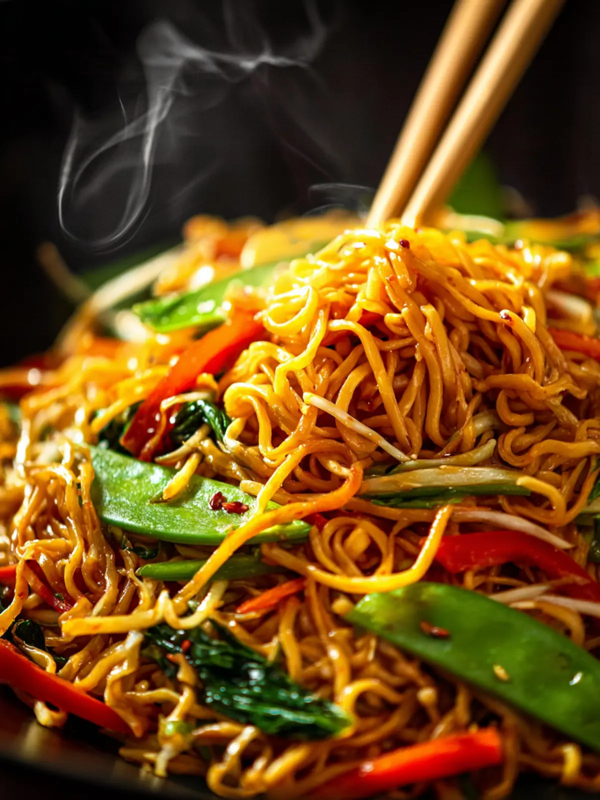 A delicious vegan stir-fried dish with Chinese noodles, vegetables, and a flavorful sauce.