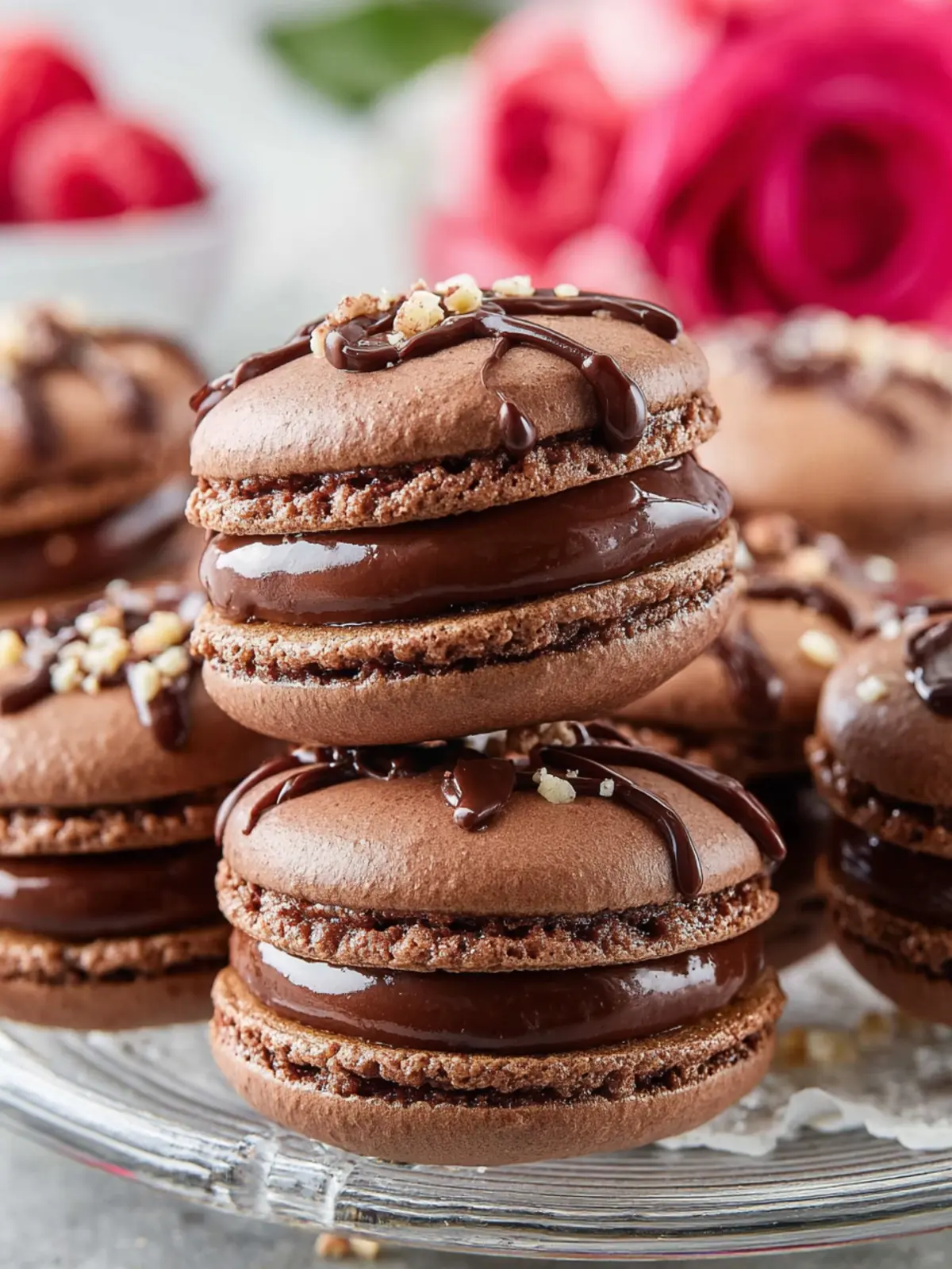 Delicious chocolate hazelnut macarons with a creamy filling.