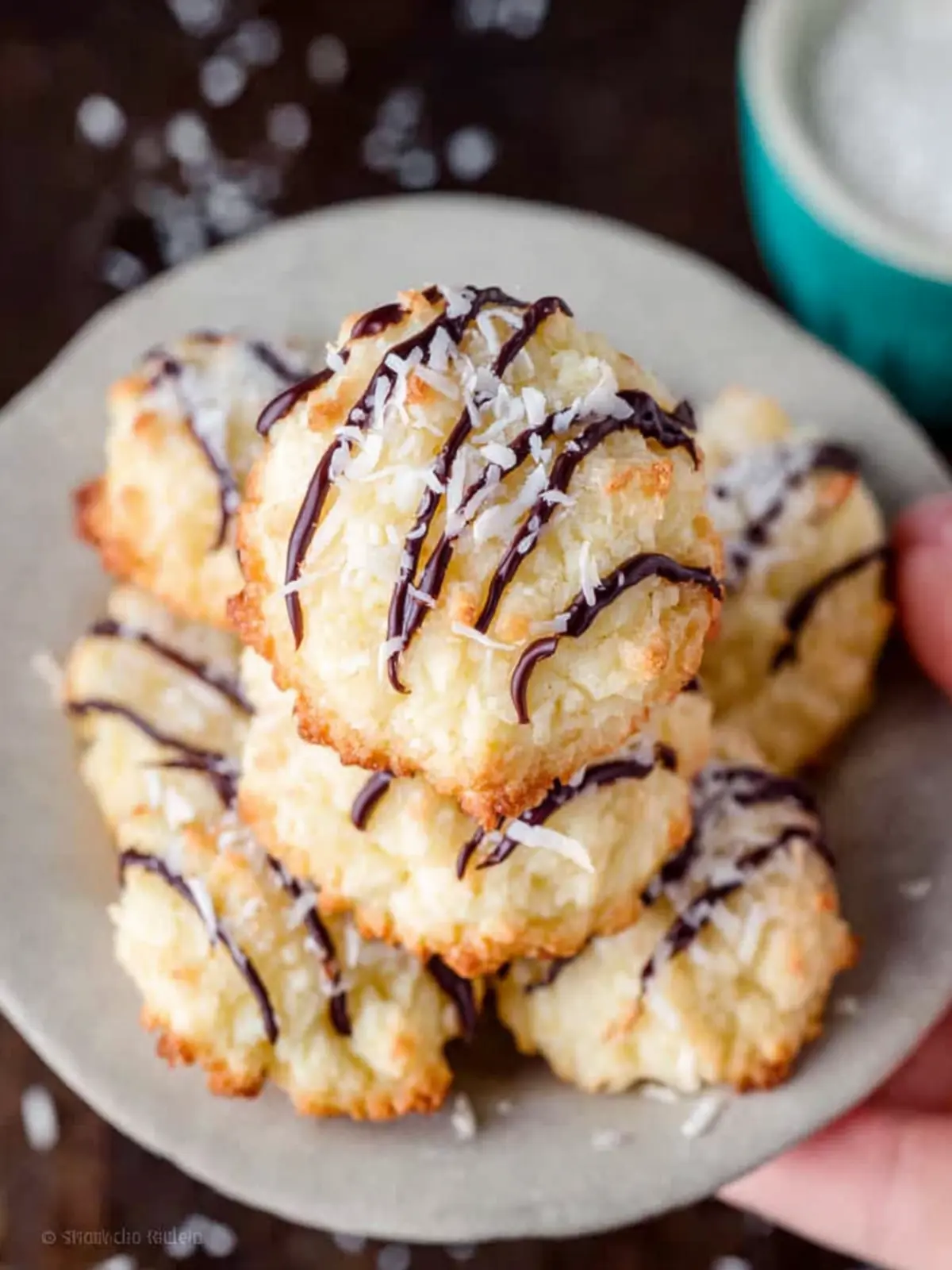 Delicious coconut cookies drizzled with melted chocolate and sprinkled with toasted coconut.
