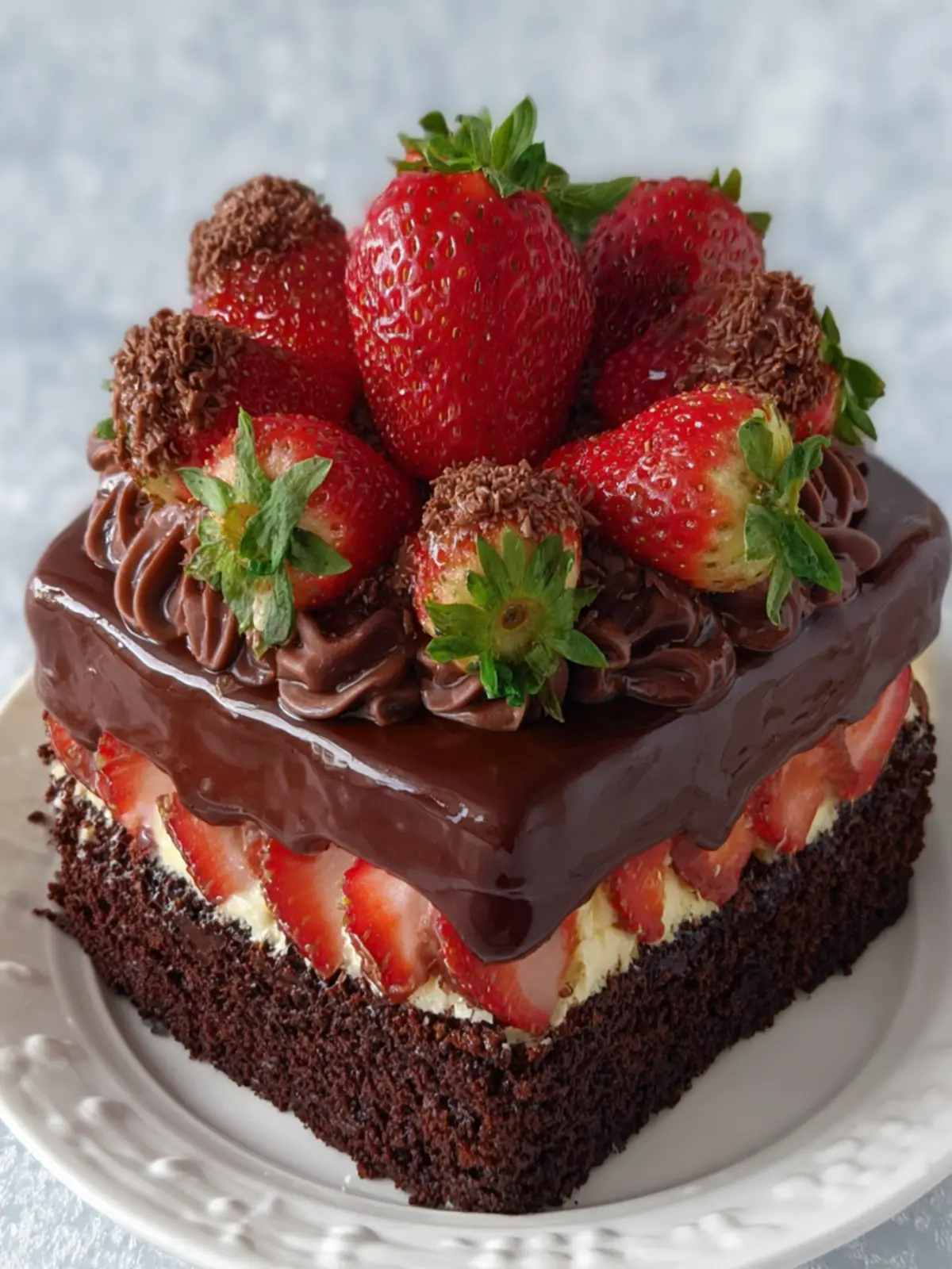 A luscious chocolate cake layered with rich chocolate ganache and topped with fresh strawberries, perfect for any celebration.