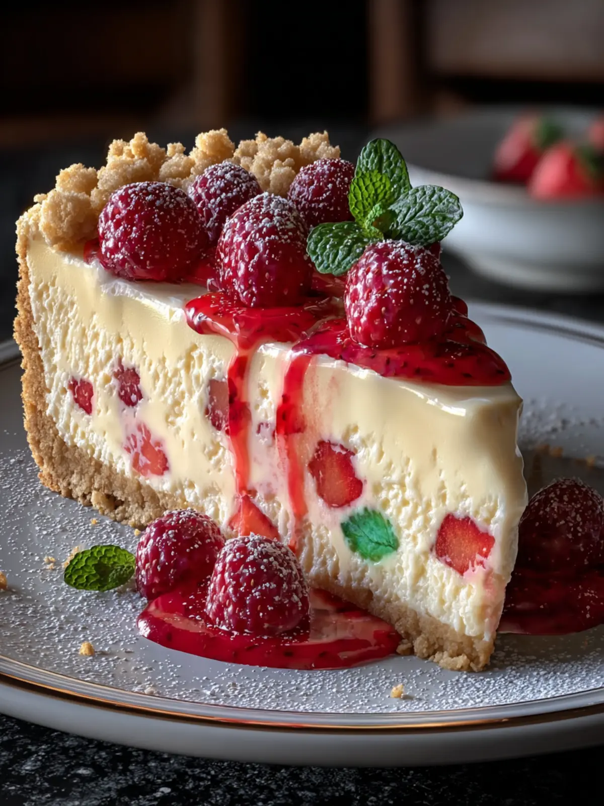 Berry Goodness: Top the cheesecake with fresh berries like strawberries, blueberries, or raspberries. Their tartness perfectly complements the sweetness of the filling.