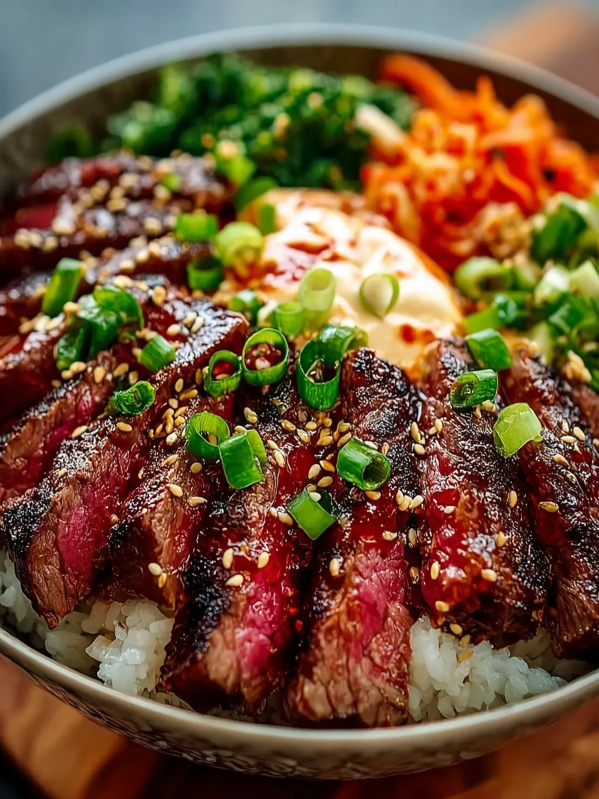 - In serving bowls, layer the cooked rice, sautéed vegetables, and sliced steak. Garnish with green onions and a sprinkle of sesame seeds.