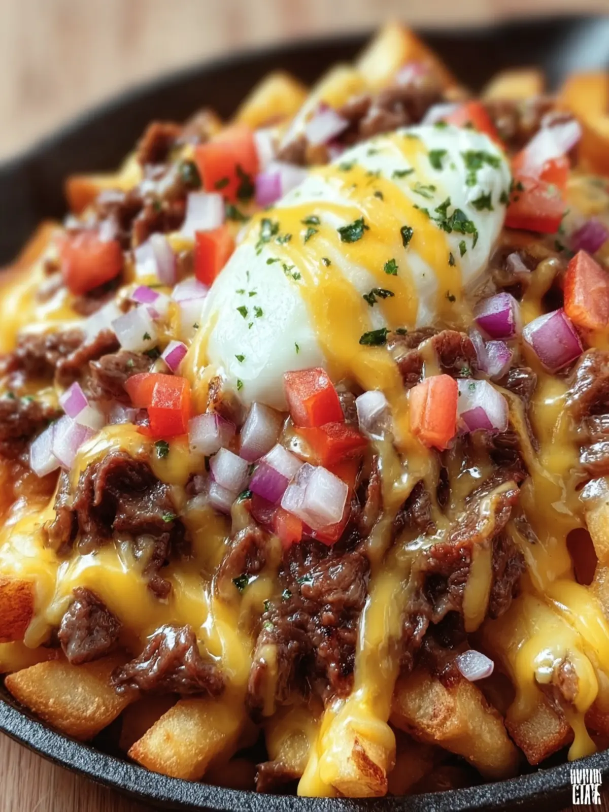 - Assemble the Loaded Fries: Once the fries are cooked, transfer them to a serving platter. Sprinkle half of the shredded cheese over the hot fries. Top with cooked steak, then sprinkle the remaining cheese. Place the eggs on top of the cheese and steak. Garnish with chopped parsley if desired.