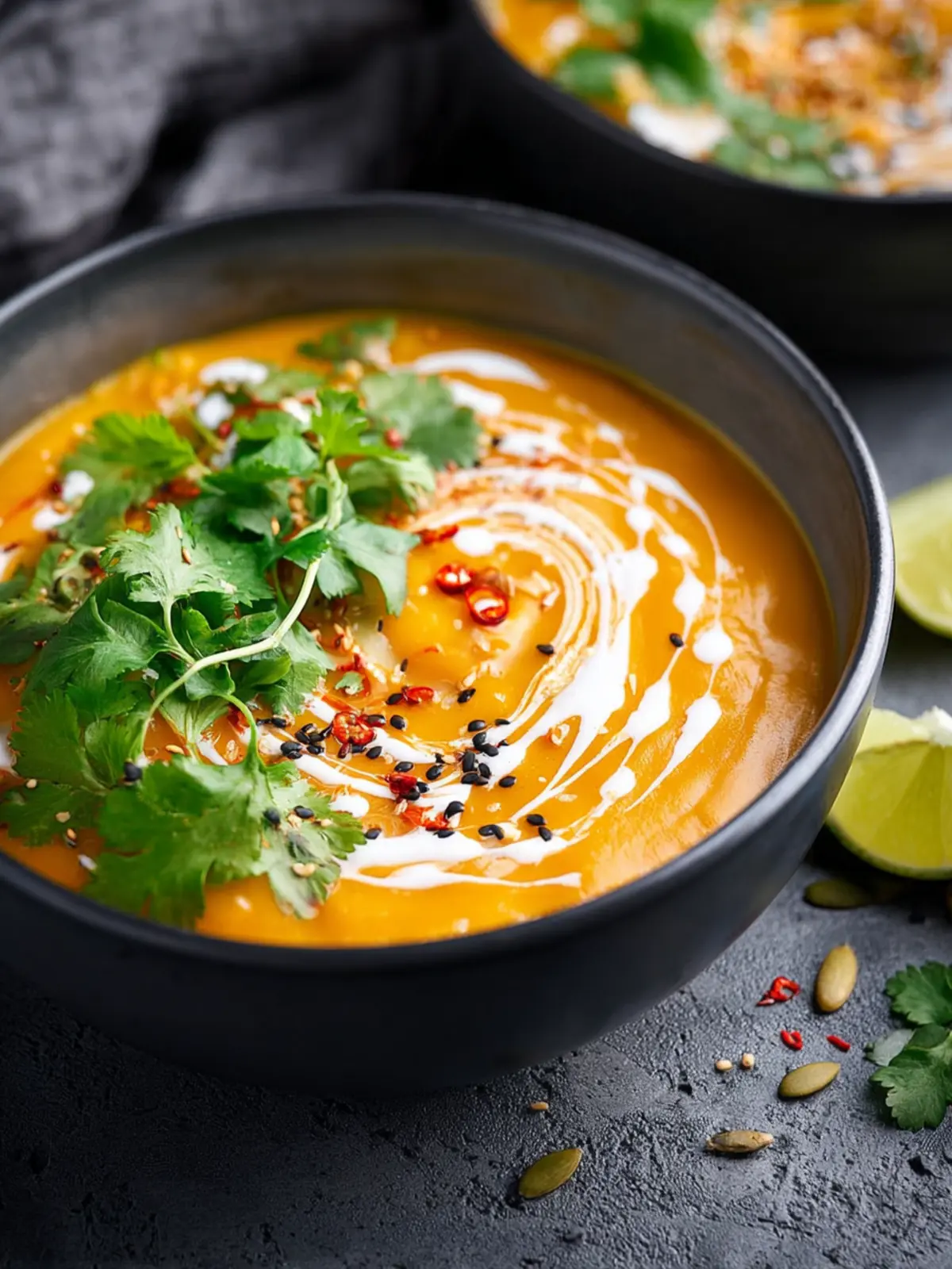 - Garnish soup with fresh cilantro, roasted butternut squash slices, sesame seeds, pumpkin seeds, coconut milk, and green onion. Enjoy!