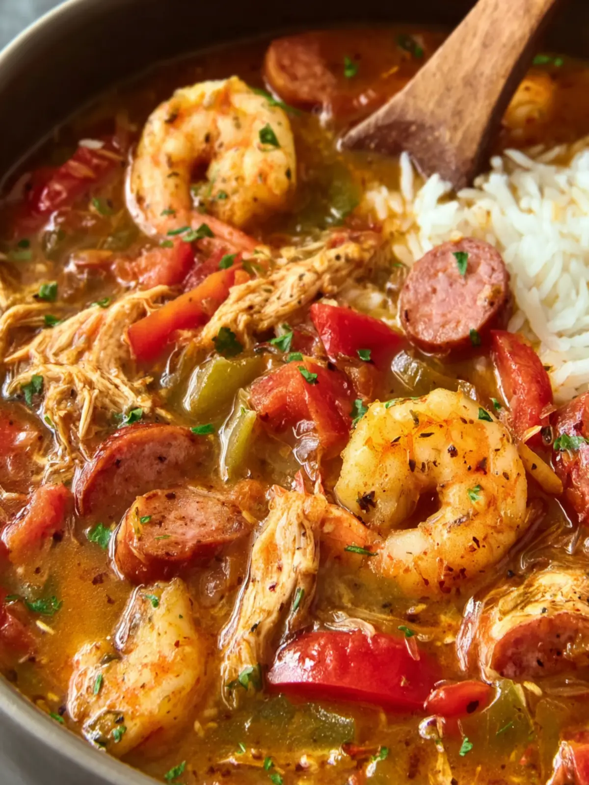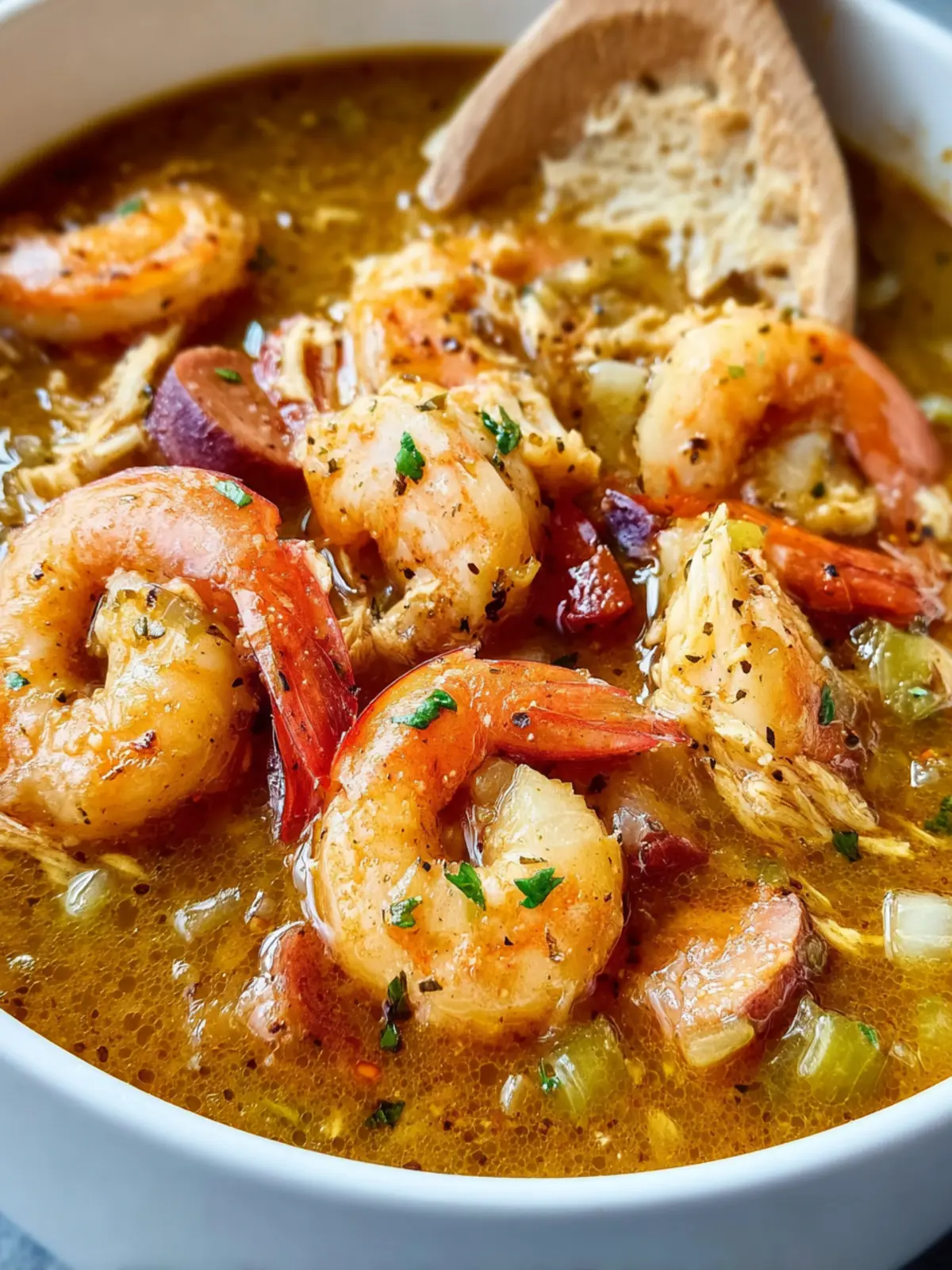 A delicious gumbo featuring andouille sausage, shrimp, and flavorful spices.