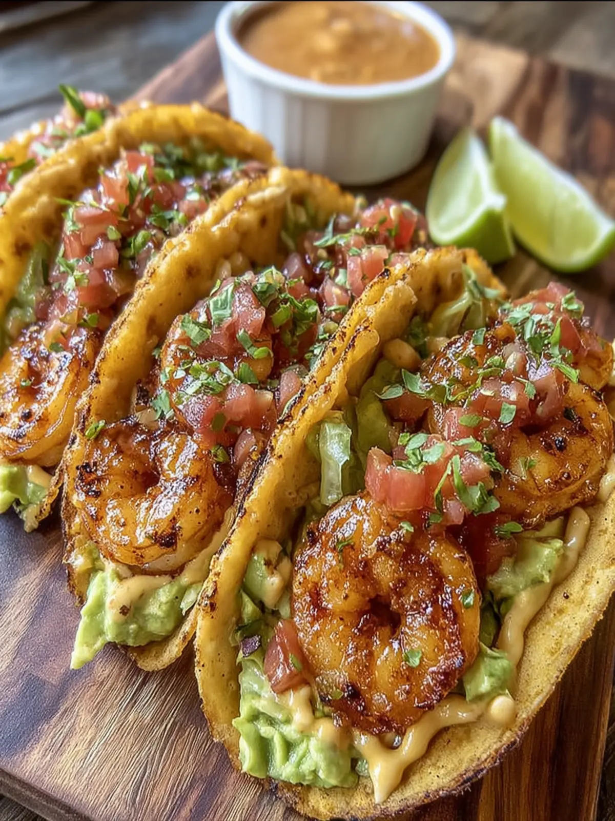 - Assemble the Tacos: Warm the corn tortillas on the grill for about 1 minute per side. Fill each tortilla with grilled shrimp, then top with diced avocado, tomato mixture, and a drizzle of the lime crema. Add hot sauce if desired.