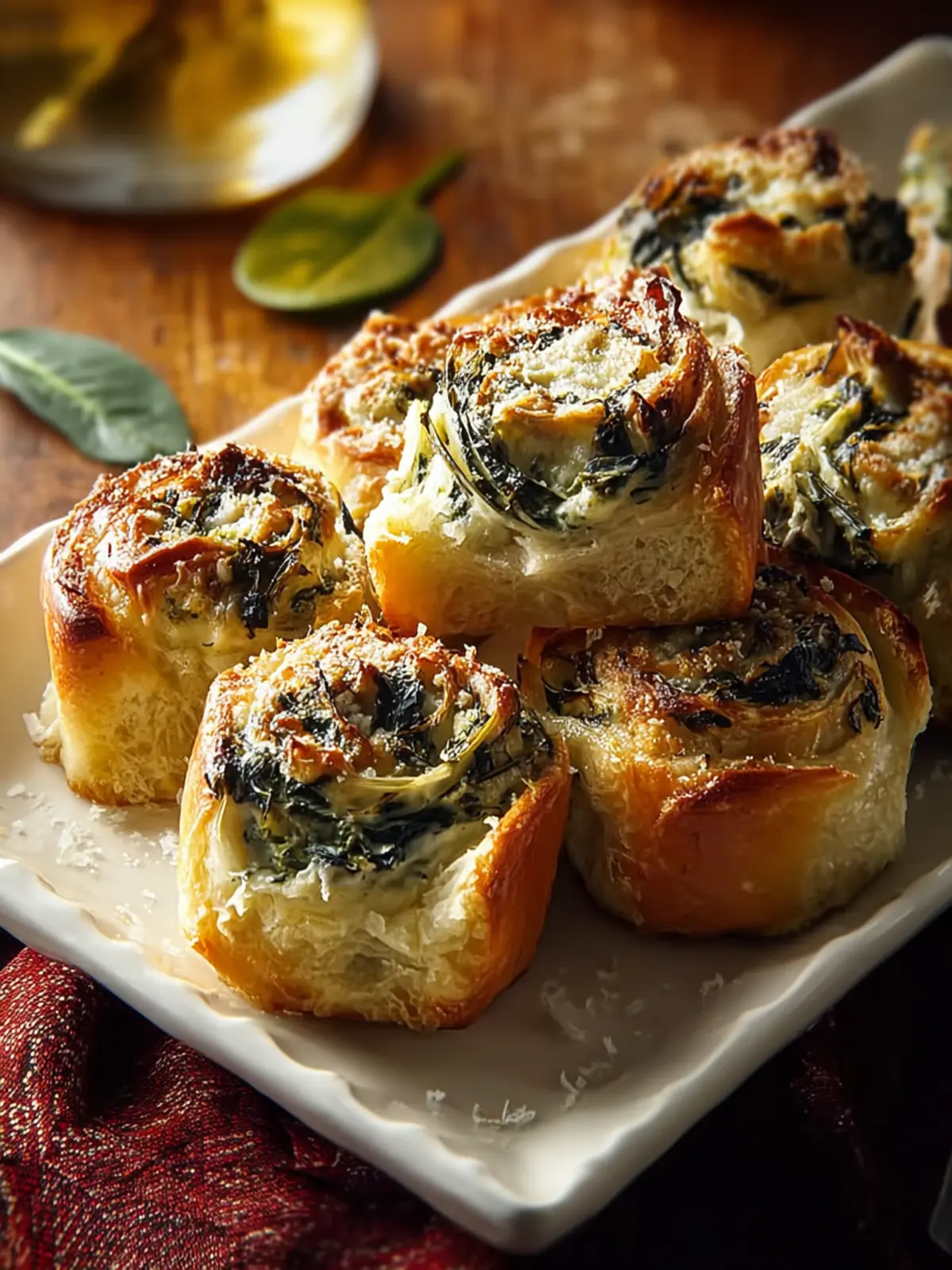 Delicious pinwheels filled with spinach, artichokes, and cheese, perfect for a warm appetizer or snack.